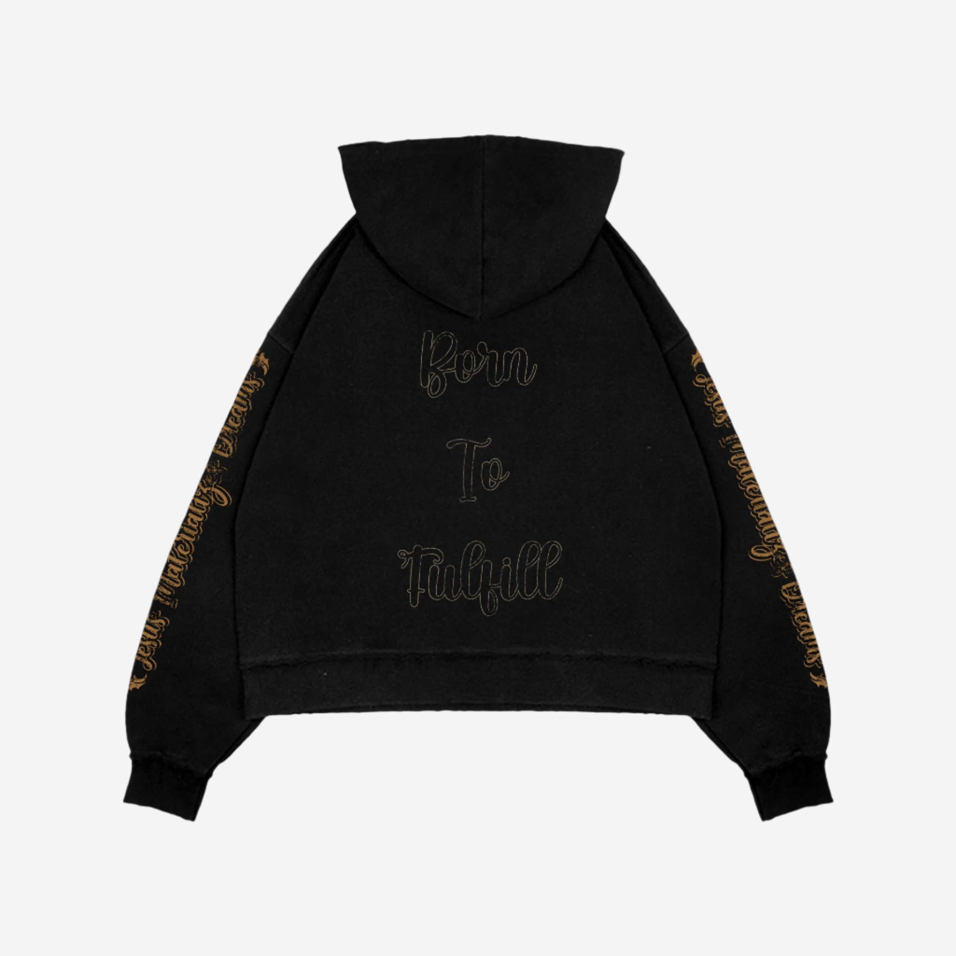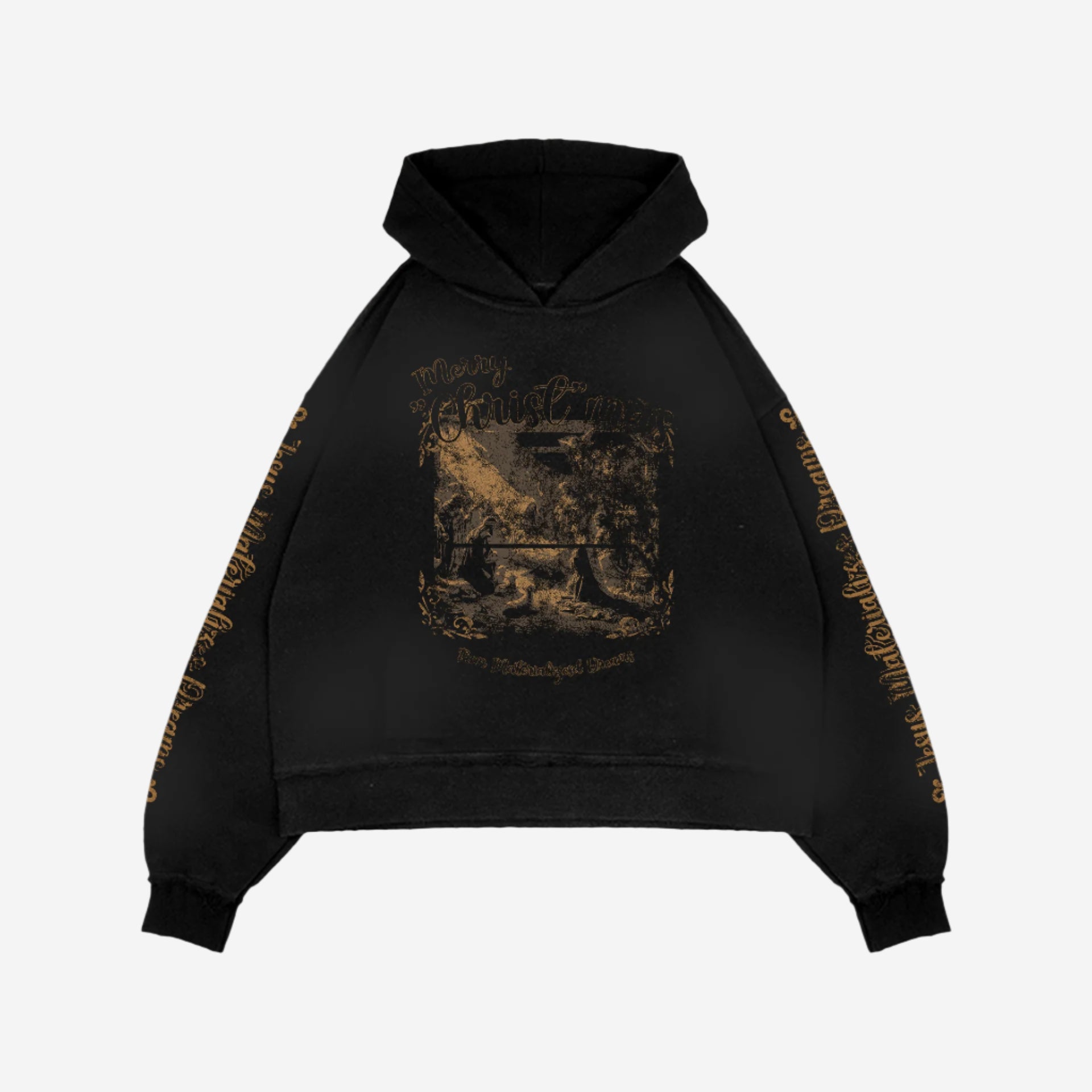 The hoodie is slightly oversized and crafted from heavyweight fabric, offering a premium feel and fit. It features an acid-wash finish and distressed details for a rugged, lived-in look. High-quality prints adorn the front, back, and sleeves, adding bold, eye-catching style.